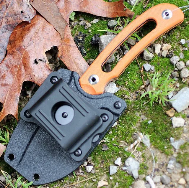 По бокам ножен расположено шесть сквозных отверстий малого диаметра, предлагающих пользователю неограниченное количество вариантов фиксации изделия на одежде, сумке и рюкзаке. В отверстия свободно продевается обычный шнурок или тонкий паракорд, который можно подвязать к лямке рюкзака, поясу и любой другой части снаряжения, на что хватит фантазии.