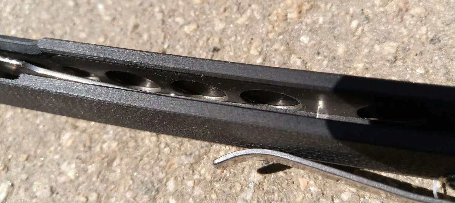 В её основе лежат металлические лайнеры из нержавеющей стали марки 420, поверх которых установлены накладки из G10. Для максимального облегчения веса в обоих лайнерах есть специальные высверленные отверстия. На прочности ножа данное решение никак не сказалось.