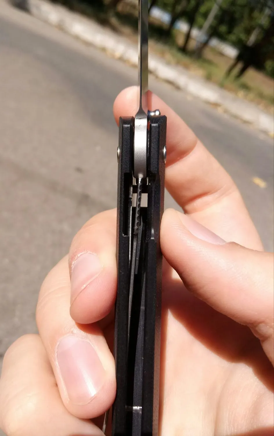 При открытии клинка пластина «заходит» под пятку лезвия примерно на 1/3-1/2 и надёжно удерживает его. Люфтов нет.