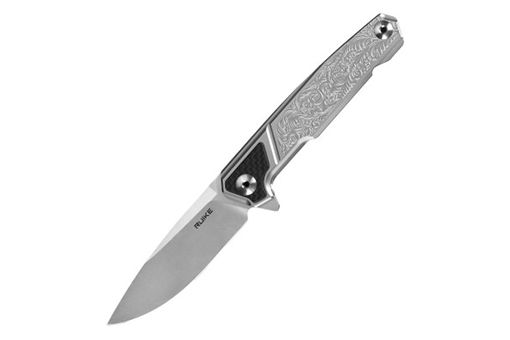 Рукоять модели – это первое, что привлекает взгляд. Одним она может показаться вычурной, другим – стильной, однако тот факт, что Ruike серьезно заморочились с дизайном во всех деталях, отрицать нельзя. Рукоять изготовлена из хромированной стали 420 и имеет эффектную гравировку в виде ветвей жимолости. На ней есть лишь небольшая противоскользящая накладка из композитного материала G10 черного цвета, однако в этом случае большего ожидать и нет смысла, поскольку данный складной нож Ruike – прежде всего EDC-инструмент, а не нож выживальщика.