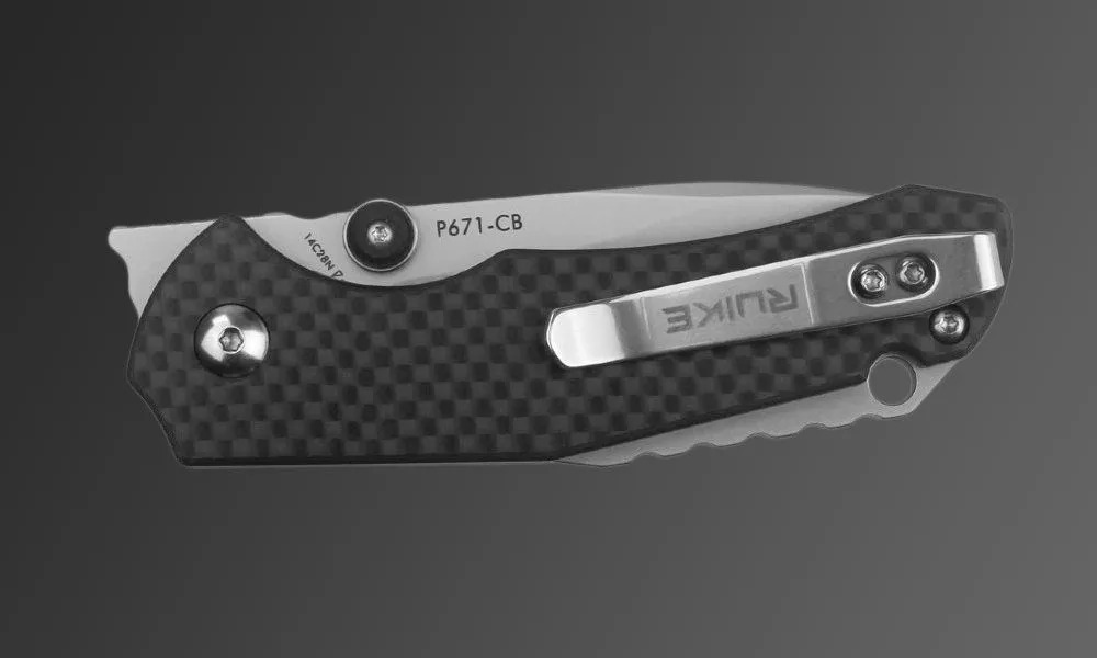 Третьей конструктивно важной частью ножа Ruike P671-CB является замок, удерживающий его лезвие в открытом положении. Эта деталь не позволяет ножу складываться во время работы и существенно повышают безопасность пользователя. В данной модели установлен замой линейного типа, который называется Liner lock. Он по праву считается одним из самых надежных среди используемых в настоящее время вариантов. К тому же, линейный замок наиболее прост в уходе и для поддержания его работы, механизм достаточно периодически чистить.