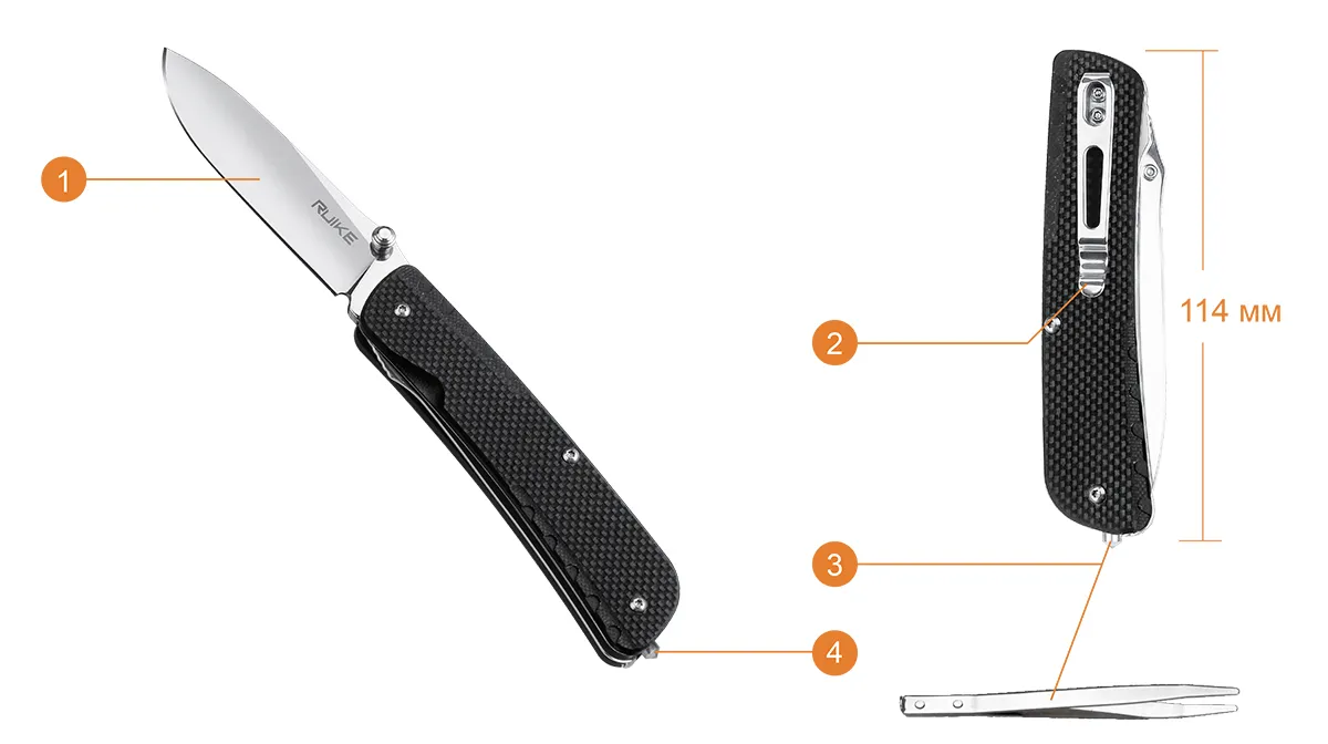 Помимо обычного клинка, модель Ruike LD11 располагает еще двумя дополнительными инструментами. В торце рукоятки расположен небольшой стальной стеклобой, который может использоваться в различных чрезвычайных ситуациях. Также из ручки достается пинцет, который можно использовать как совершенно отдельный инструмент.