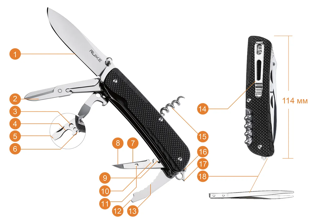 Кроме ножа, в модели Ruike LD31 имеется еще целый ряд инструментов. В частности, схожим с ножом образом, достаются ножницы, а также прямая отвертка, открывалка для бутылок и пара инструментов для зачистки проводов разного диаметра. Аналогично ним, с другой стороны рукоятки пользователь может достать широкое шило с ушком для продевания нитки и еще двумя инструментами для зачистки проводов, а также резак для ремней, на конце которого размещена еще одна прямая отвертка – на этот раз меньшей ширины. На верхней части ручки ножа помещен складной штопор, а в ее торце – стеклобой и небольшое кольцо, чтобы Ruike LD31 можно было носить на цепочке. Этот нож также можно закрепить на ремне, используя для этого клипсу, которая находится на одной из боковых поверхностей рукоятки.