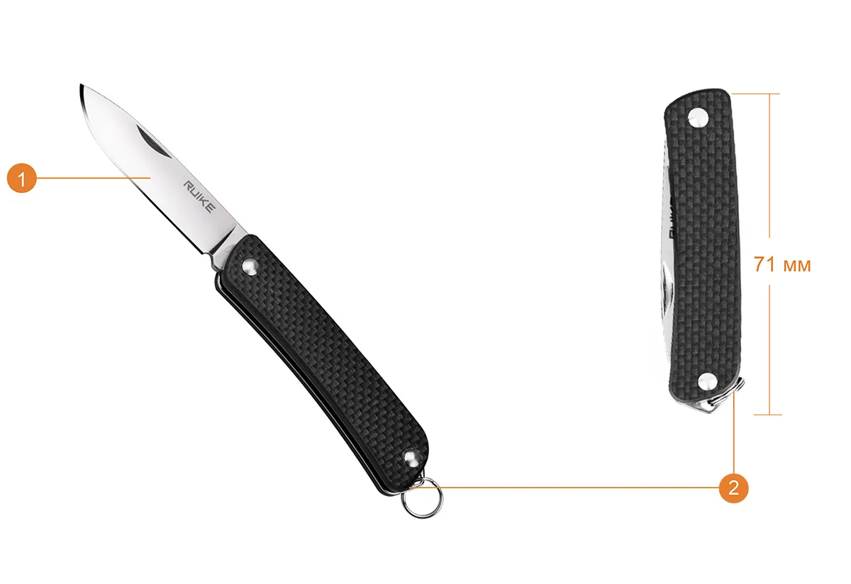 Ruike S11 привлекает внимание своими скромными габаритами. Такой нож уж точно не будет тяжело носить в кармане. Кроме того, в его конструкции предусмотрено стальное кольцо для ношения в роли брелка. К нему также можно прикрепить темляк. Вес данной модели равен лишь 30 грамм. А длина этого ножа в сложенном виде составляет 71 мм. Нож располагает остро заточенным и гладко отполированным лезвием длиною 53 мм и толщиною 2 мм. Его режущая кромка по всей длине остается ровной. Форма клинка достаточно широко распространенная – Drop point. Чтобы открыть этот нож, клинок следует поддеть ногтем за специально оставленную для таких целей насечку. Складывается он без особого труда, поскольку лезвие фиксируется за счет трения при помощи конструкции Slip joint. Но несмотря на отсутствие жесткой фиксации, работать с Ruike S11 безопасно и этот нож в состоянии выдержать приличные нагрузки.